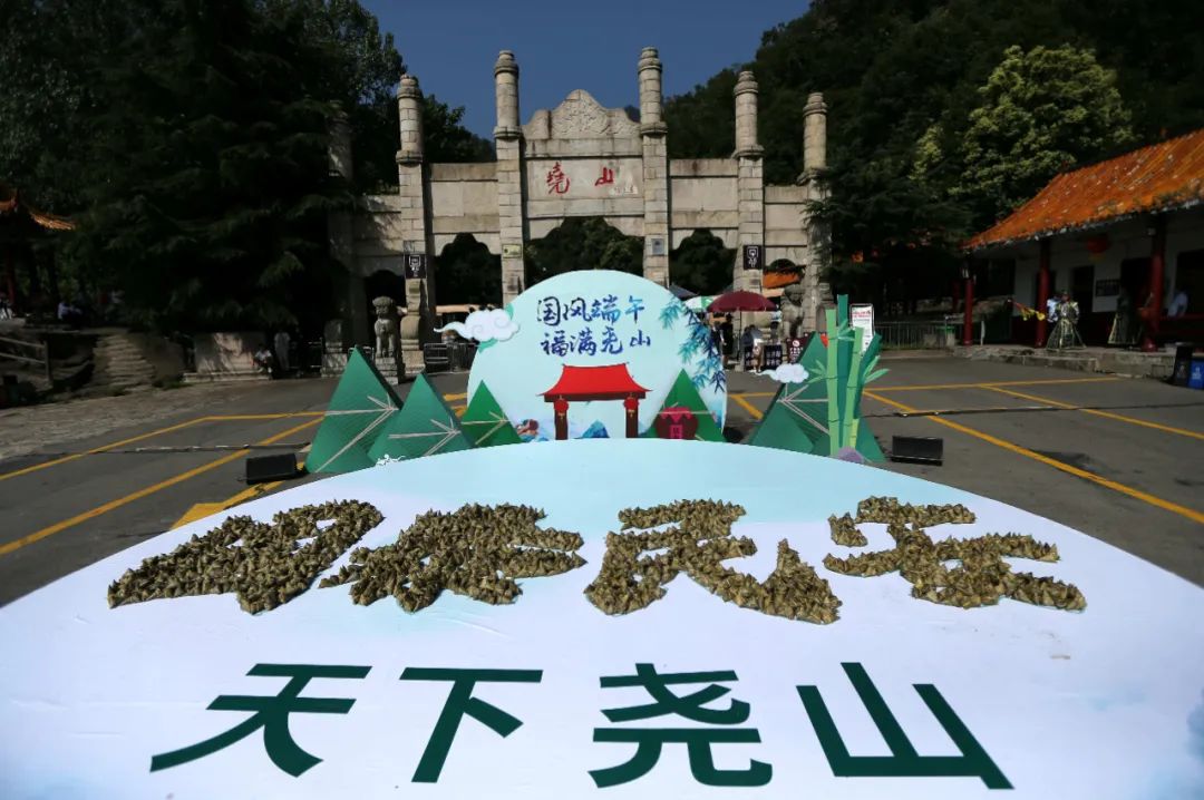 端午節(jié)期間,中華傳統(tǒng)文化與自然山水在此激烈碰撞,巧妙融合,堯山游客朋友們紛紛感受到別樣端午氛圍。在古風(fēng)滿滿的堯山山門口,以粽子在地上擺出“國(guó)泰民安”四個(gè)巨幅大字,寓意堯山為祖國(guó)送上誠(chéng)摯祝福。