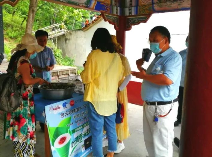 除了在堯山山門口,景區(qū)內(nèi)碑廊和索道上站處也設(shè)置了“放粽去旅行”主題活動(dòng)粽子派發(fā)點(diǎn),小小粽子包住了濃濃端午情,游客們紛紛排隊(duì)領(lǐng)取香粽,開心地收下堯山送上的端午祝福。
