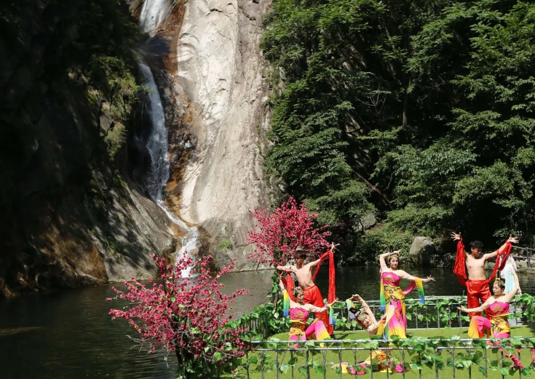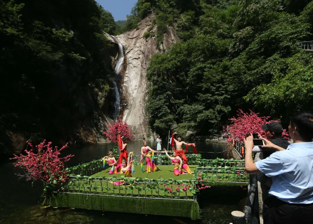 在景區(qū)內(nèi),精彩活動(dòng)表演依然在持續(xù)上演:在堯山風(fēng)景區(qū)內(nèi)著名的景點(diǎn)九曲瀑布前,數(shù)名身著華服的專業(yè)舞者翩翩起舞,優(yōu)美的舞姿與背后的磅礴瀑布相映成趣,現(xiàn)場(chǎng)活靈活現(xiàn)的表演別具一番風(fēng)情。