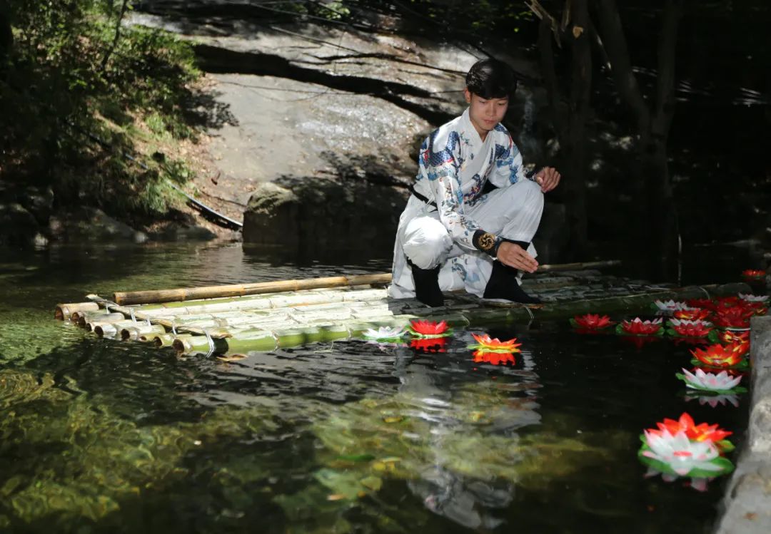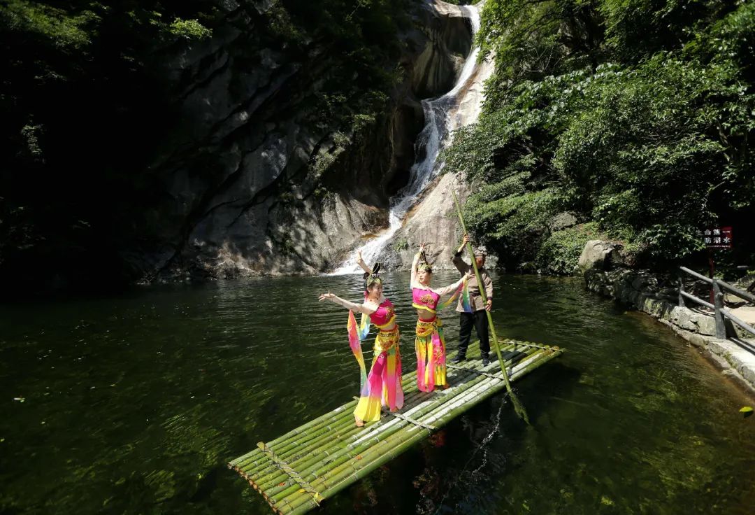在瀑布下方,忽然出現(xiàn)一頁(yè)別致典雅的竹排。一時(shí)恍若進(jìn)入了微觀的江南世界,很難想象地處中原的河南堯山竟也出現(xiàn)如此溫婉秀雅的景致。竹排飄浮在清澈見底的黑龍?zhí)渡希碇欧拇蚺c舞者儼然形成了一副穿越古今的寫意畫卷。