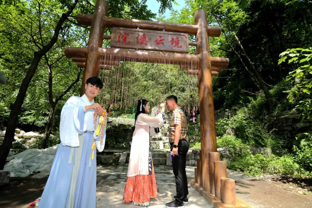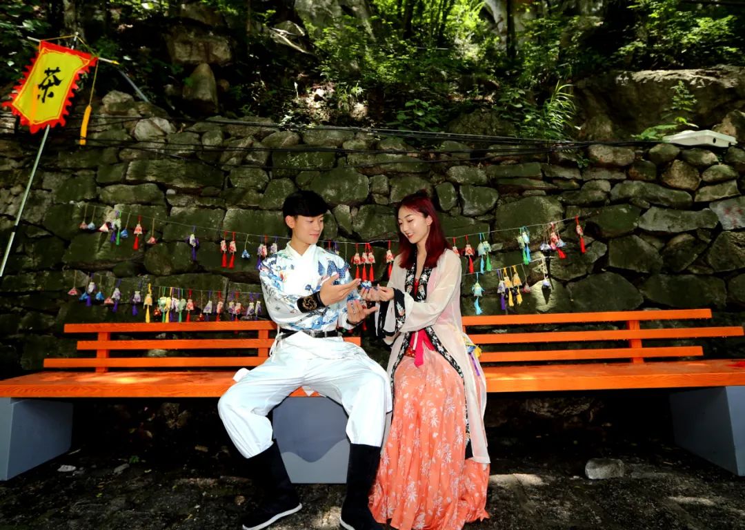 在堯山著名賞水路線“浣溪云境”的入口,身著漢服的小哥哥小姐姐貼心地為游客朋友們系上寓意著吉祥安康的五彩繩,代表景區(qū)為八方游客送上貼心祝福,濃濃的端午情讓每個(gè)游客都倍感暖心。