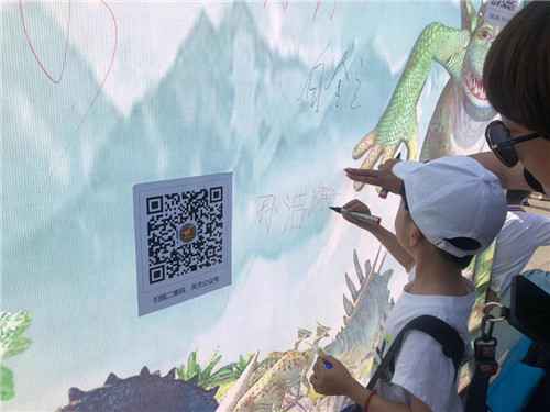 每對(duì)親子在簽名墻上簽名,還可獲得恐龍園贈(zèng)送的徽章一枚隨即入園。