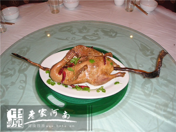 此種菜肴用料為當?shù)剞r(nóng)家鴨。用當?shù)靥夷究局贫,脆皮、里嫩,香酥可口,可與北京“全聚德烤鴨”比美,而且用料考究、制作獨特,是八里溝當?shù)剡^去富裕人家待客的主要菜肴。