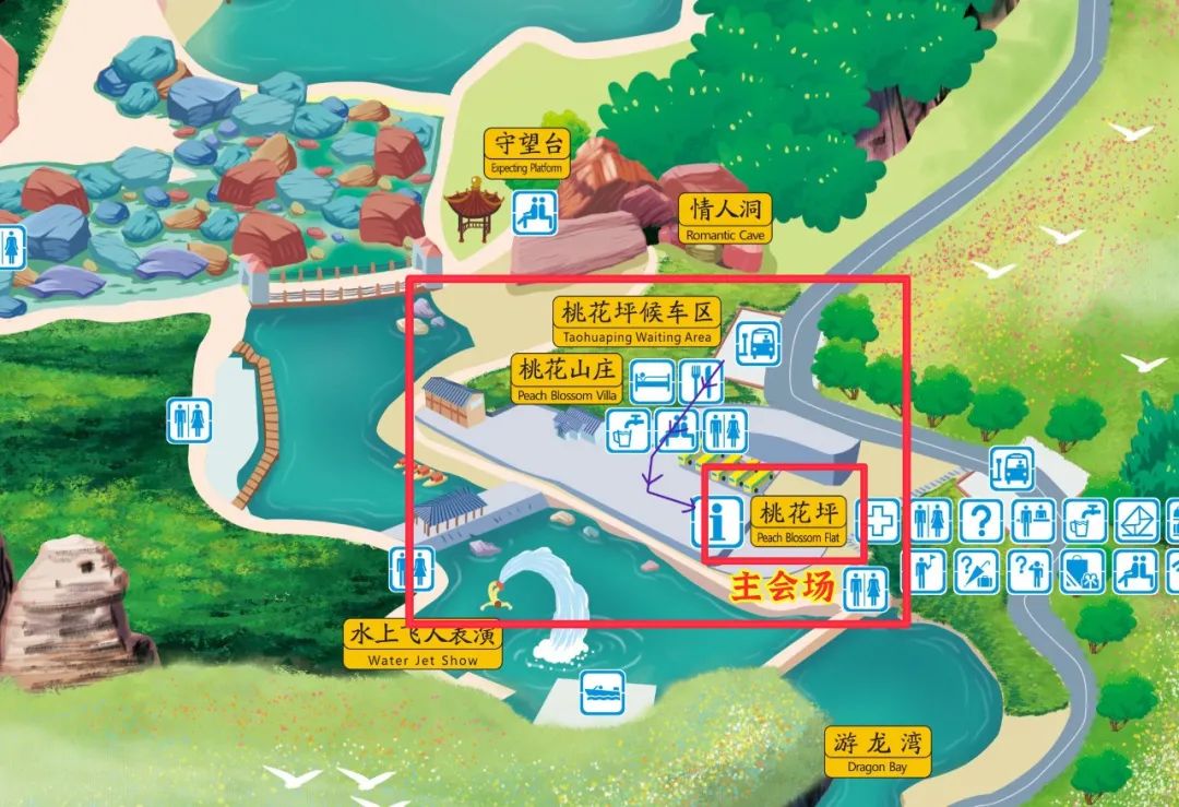 從景區(qū)游客中心坐小交通到達(dá)桃花坪候車(chē)區(qū),下樓梯后往桃花坪方向前進(jìn)即可到會(huì)場(chǎng)區(qū)。