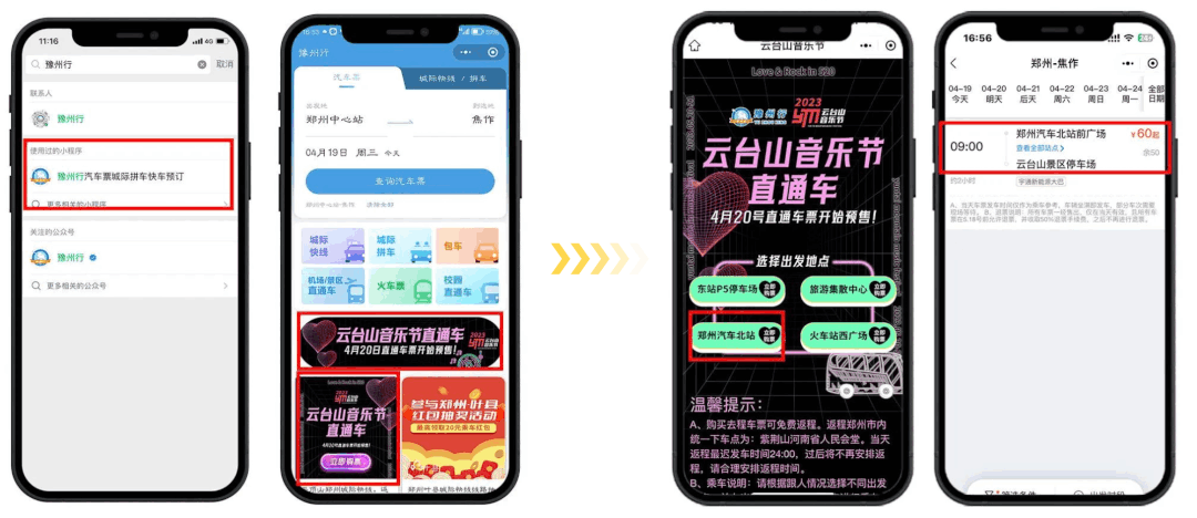 1、如圖所示:微信搜索“豫州行”小程序,選擇云臺(tái)山音樂(lè)節(jié)直通車。