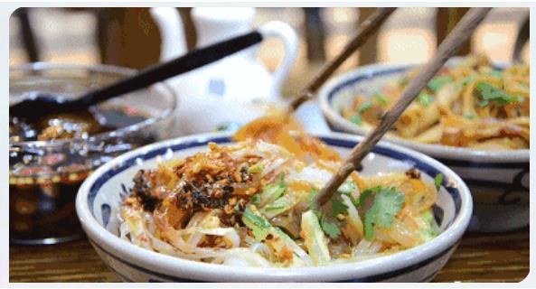 在小鎮(zhèn)的街頭走一走,再吃上一碗色白、光潤、皮薄、細軟、柔韌的秦鎮(zhèn)米皮,拌上特制的辣椒油、醋和鹽,加上芹菜丁和豆芽、黃瓜絲等小菜,一碗看來紅通通、吃來“筋、薄、細、軟”、涼爽可口的秦鎮(zhèn)米皮就能給你帶來一份滿足,這才叫爽。