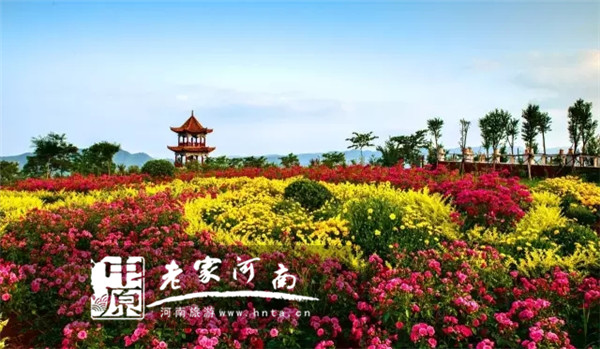 淡藍(lán)的天空連著翻卷的白云,靜謐安詳,成片的花海裹挾著矗立的攬芳亭仿佛要飛向云端。
