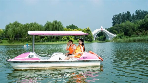 腳踏船的船體由玻璃鋼材料制作,安全輕便。每輛游船限乘四人,非常適宜一個家庭或三四好友乘坐游玩。自己劃船在湖中暢游,體驗乘船游覽園博園的獨特魅力。