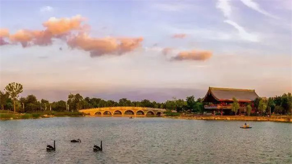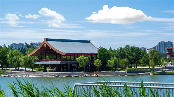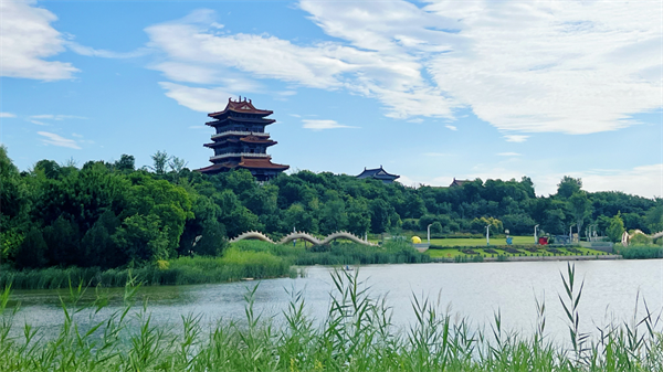 同心湖水面開闊,沿岸綠樹環(huán)繞、亭臺閣影倒映水中,絢麗多姿。