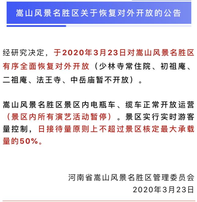 記者從嵩山風(fēng)景名勝區(qū)管委會(huì)獲悉,經(jīng)研究決定,3月23日,嵩山風(fēng)景名勝區(qū)在做好疫情防控工作的前提下,已有序恢復(fù)開放。但少林寺常住院、初祖庵、二祖庵、法王寺、中岳廟暫不開放,并暫停景區(qū)內(nèi)所有演藝活動(dòng)。景區(qū)實(shí)行實(shí)時(shí)游客量控制,日接待量原則上不超過景區(qū)核定最大承載量的50%。