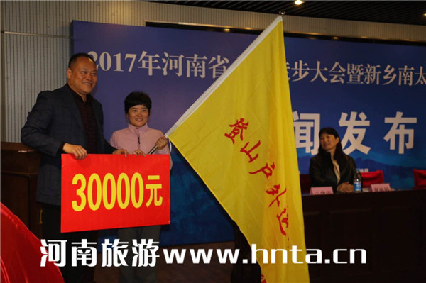 發(fā)布會(huì)上,省旅游局旅游促進(jìn)處處長(zhǎng)湯雁、省社會(huì)體育管理中心主任陳真分別致辭,新鄉(xiāng)南太行旅游有限公司總經(jīng)理王紅昌介紹新鄉(xiāng)南太行概況及活動(dòng)組織情況。此外,發(fā)布會(huì)還進(jìn)行了一項(xiàng)特別的儀式,省體育局群體處處長(zhǎng)趙峻為河南登山愛(ài)好者、曾積極參與登山營(yíng)地救援工作的醫(yī)務(wù)工作者董麗麗同志進(jìn)行了授旗。最后,省旅游局旅游促進(jìn)處處長(zhǎng)湯雁、省體育局群體處處長(zhǎng)趙峻、省社體中心主任陳真、新鄉(xiāng)市外事僑務(wù)旅游局局長(zhǎng)崔紅、新鄉(xiāng)市體育局副局長(zhǎng)王建華、新鄉(xiāng)南太行旅游有限公司總經(jīng)理王紅昌共同觸摸啟動(dòng)球,宣告2017年河南省全民徒步大會(huì)暨新鄉(xiāng)南太行崖上徒步文化年活動(dòng)開(kāi)幕。