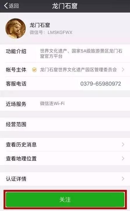 1、首先打開微信,掃描福道兩旁牌子上的“微信猜燈謎”活動二維碼,點擊關(guān)注龍門石窟官方微信。