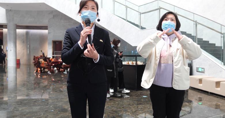 2月12日,記者在河南省平頂山市汝州市青瓷博物館看到,館內(nèi)的講解員和手語翻譯員相互配合,為前來參觀的游客進(jìn)行服務(wù)。