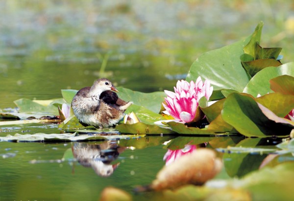 一只水鳥在睡蓮邊休息