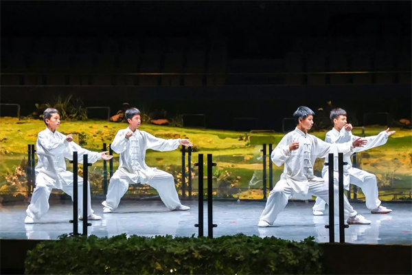 伴隨著扣人心扉的太極鼓樂,只見高臺上四位武者一招一式一氣呵成,或有招式轉(zhuǎn)換,也似筆斷意連,盡顯功夫魅力。舞臺充斥著水墨、留白元素等東方意境美,讓觀眾在動靜之間感受太極文化。