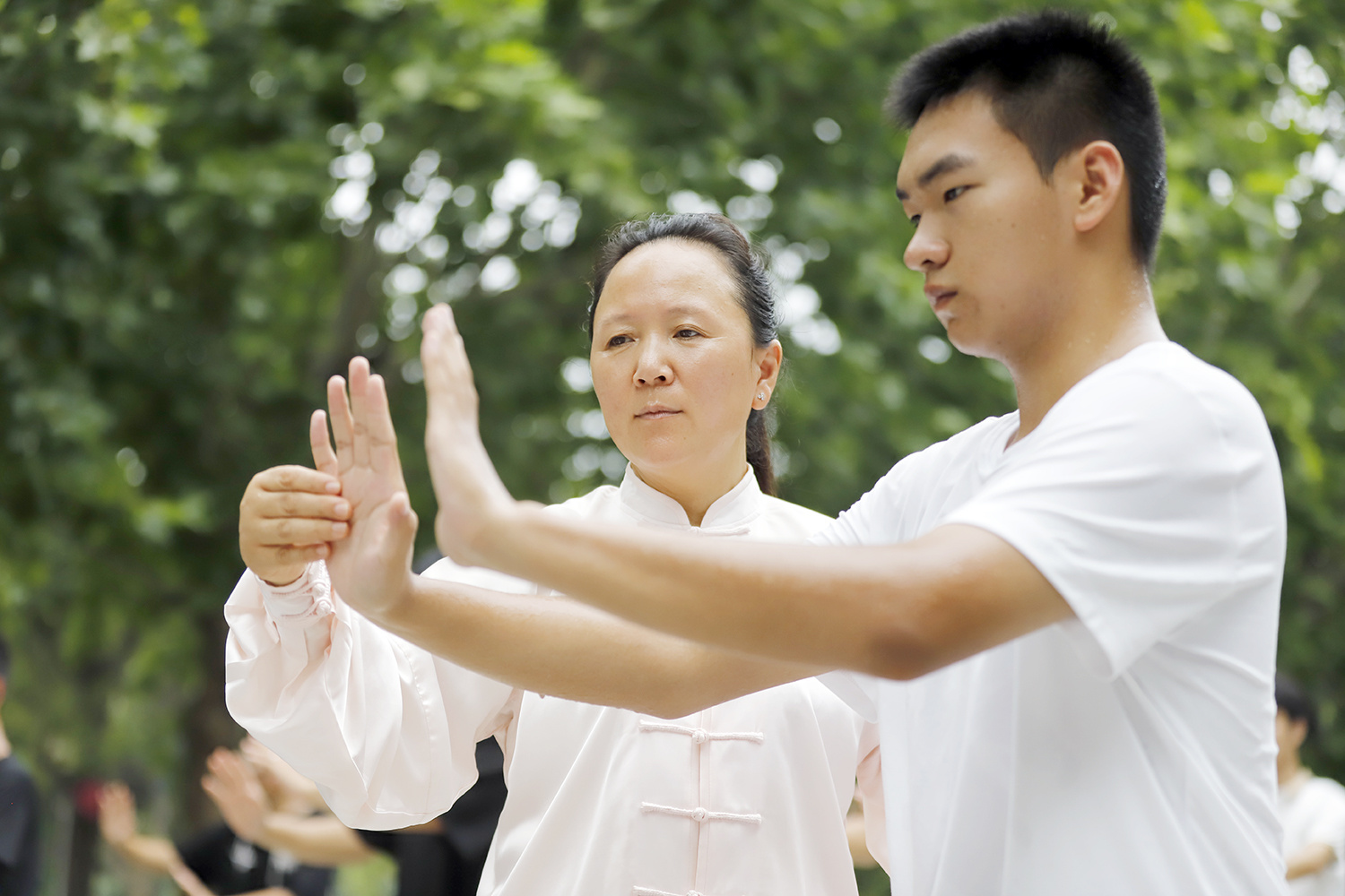 太極拳師陳朝霞為學(xué)員調(diào)整拳架 溫縣融媒體中心供圖