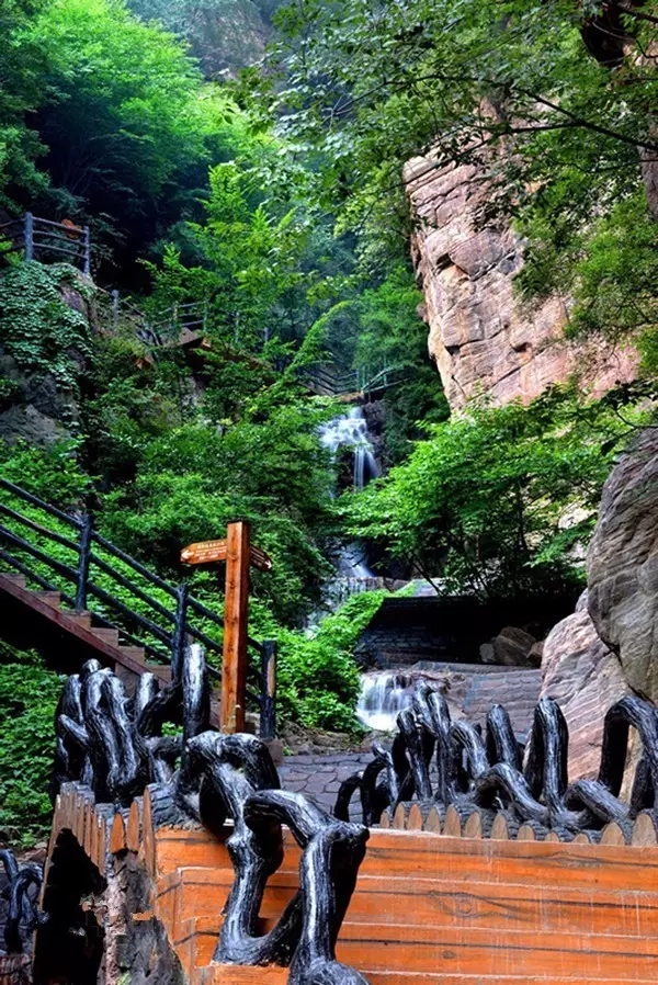天路奇觀是黛眉山的一條峽谷,山水游線,長1000米,有1688個臺階。天路兩側(cè)巨峰對峙,直插云霄,峽谷又深又長,蜿蜒伸展向天際,好像一條通天之路,沿途風景壯美奇特,撼人心魄。天路奇觀由迎賓棧道、黛眉三潭(洗心潭、清心潭、靜心潭)、山澗飛瀑、赤壁丹崖等景點組成,一路上奇山、奇水、奇峰、奇路、奇石叫人嘆為觀止。