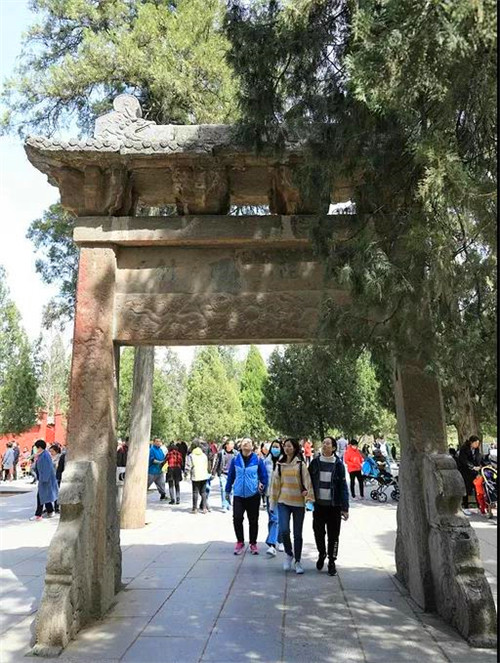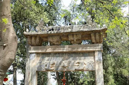 山門(mén)前東西兩側(cè)有兩座建于明代大石坊,東西對(duì)稱(chēng),制式相同。二石坊都由青石構(gòu)造而成,形制基本相同,皆為雙柱單孔廡殿式建筑。東、西坊高都為6.15米,坊面闊3.86米。成為山門(mén)前區(qū)域的東、西標(biāo)志。