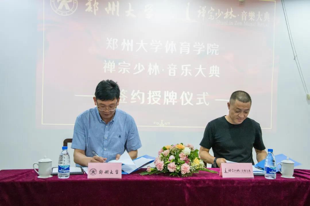 鄭州大學(xué)體育學(xué)院(校本部)黨委書記武東曉、院長趙子建、學(xué)院黨委副書記孫振波、副院長司紅玉、副院長張秀麗、院團(tuán)委負(fù)責(zé)人牛濤濤、院學(xué)工辦主任翟星辰,鄭州市天人文化旅游有限責(zé)任公司《禪宗少林·音樂大典》總經(jīng)理韓剛、藝術(shù)總監(jiān)王志敏、副總經(jīng)理?xiàng)畲焊ΑI銷總監(jiān)毛榮軍以及各部門負(fù)責(zé)人、公司員工參加了此次簽約授牌儀式。
