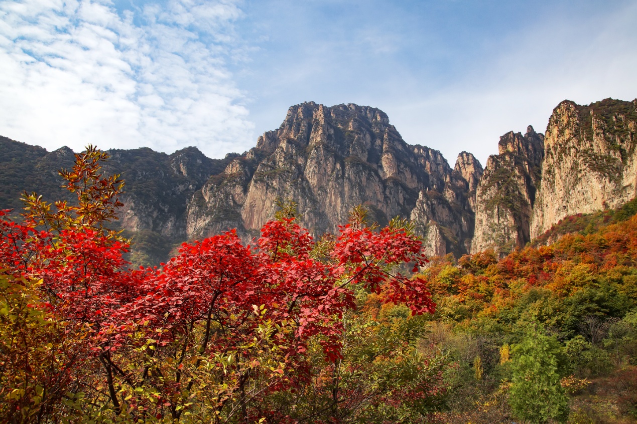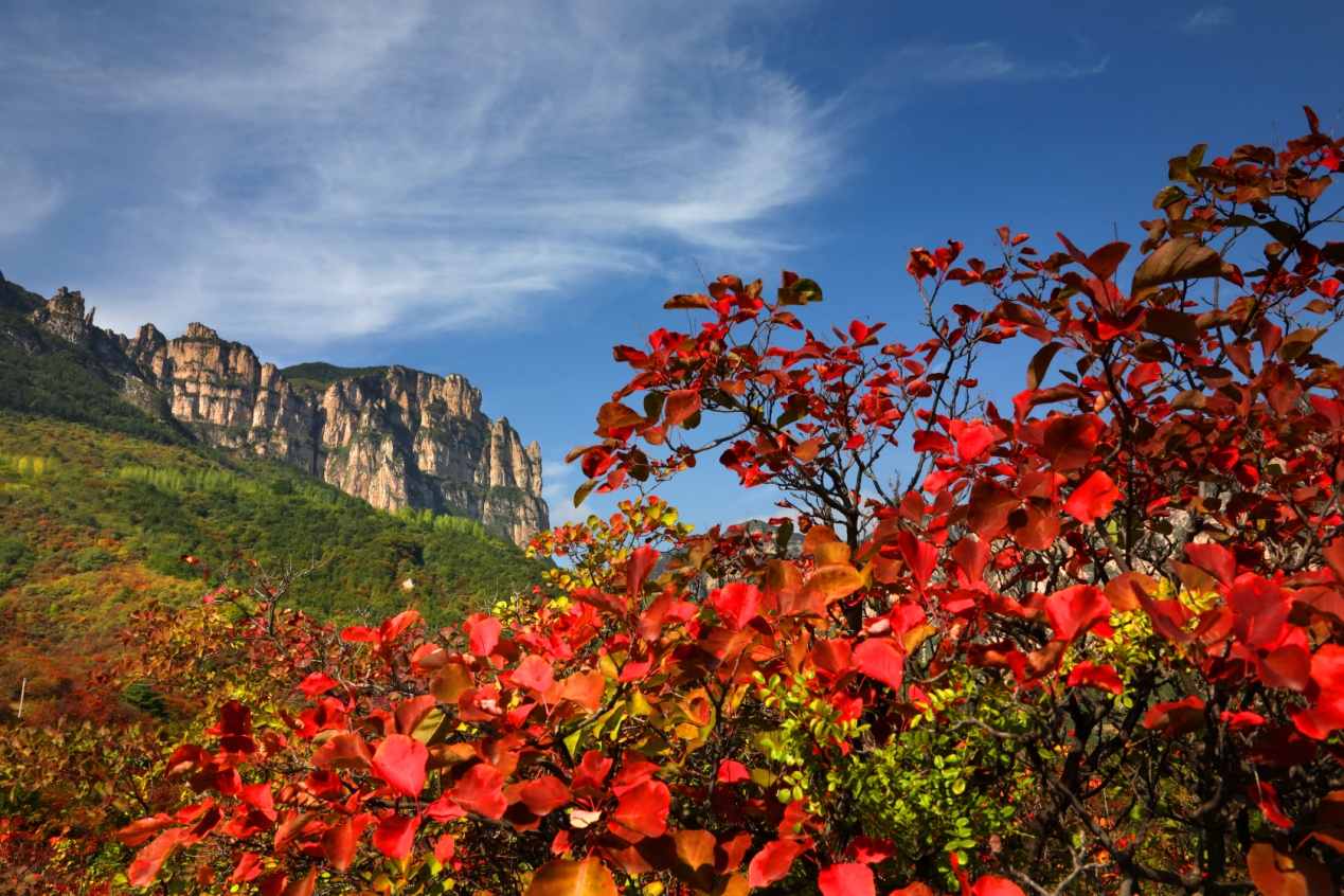 金秋十月,隨著天氣轉(zhuǎn)涼,晝夜溫差變大,河南林州太行大峽谷漸漸浸染秋色。登高遠(yuǎn)眺,似火的紅葉猶如一團(tuán)團(tuán)燃燒的火焰,重巒疊嶂間層林盡染。大自然揮毫潑墨,于翠峰碧水間繪出萬千景致,定格出一幅濃墨重彩的秋日畫卷,置身其間,讓人心曠神怡,嘆為觀止。