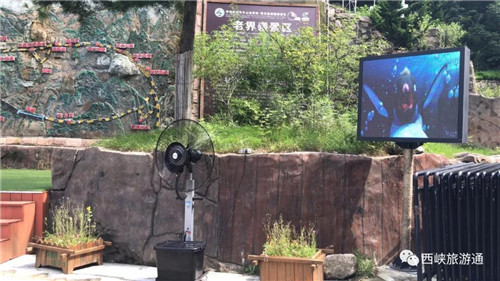 老界嶺景區(qū)為排隊購票顧客免費發(fā)放老界嶺山泉水以及增加水霧風(fēng)扇等降溫設(shè)備!