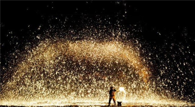 抬頭望去,一團(tuán)火焰盡情扭動(dòng),先是星星點(diǎn)點(diǎn),誘惑著觀眾,繼而鐵水溫度激增,突然間火輪飛轉(zhuǎn),火焰生風(fēng),熾熱的鐵水迅速打開(kāi),彌漫飛揚(yáng)。