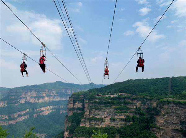 心跳、刺激、驚心動(dòng)魄,300米高空俯瞰谷中美景,像鳥兒一樣展翅凌空聽著風(fēng)呼嘯而過。太行大峽谷高空滑索由平步青云上方“飛”至羞女峰觀景臺(tái),跨越峽谷長度500米,離谷底有300米落差,在體驗(yàn)驚險(xiǎn)刺激的同時(shí),可將蜿蜒曲折的景區(qū)道路以及U型天坑的美景360度盡收眼底,同時(shí)還能瀏覽到天路周邊百花盛開的旖旎風(fēng)光,最重要的是你可以放開嗓子盡情的呼喊,周圍的游人只能投來羨慕嫉妒的眼光。