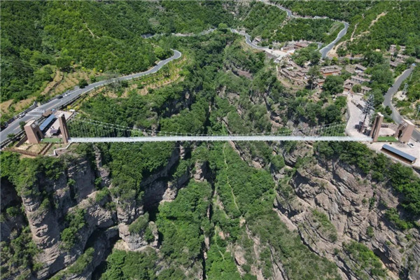 太行大峽谷玻璃橋,位于太行天路景點(diǎn),橋面長280米、寬2.5米、橋面距谷底相對(duì)高度260米,橋面采用全透明玻璃鋪設(shè)。玻璃橋選用新型復(fù)合材料建造,橋面采用先進(jìn)的9D音頻技術(shù)。站在橋上除了居高臨下欣賞太行大峽谷的壯闊風(fēng)景,一覽峽谷的心曠神怡之外,更能體驗(yàn)透空踩踏的刺激與驚奇。