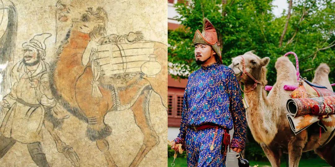 據(jù)該復原秀負責人介紹,這一場景是對壁畫《胡人牽駝載絲》的復原。2005年,唐安國相王孺人墓于今翠云路與厚載門街交叉口附近被發(fā)現(xiàn),考古過程中,《胡人牽駝載絲》壁畫于墓中被發(fā)掘,現(xiàn)藏于洛陽古墓博物館。