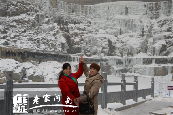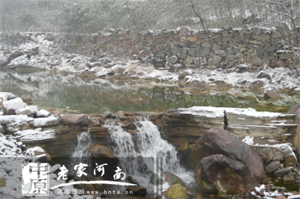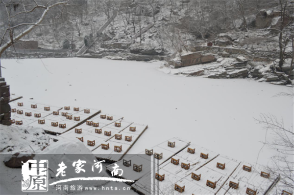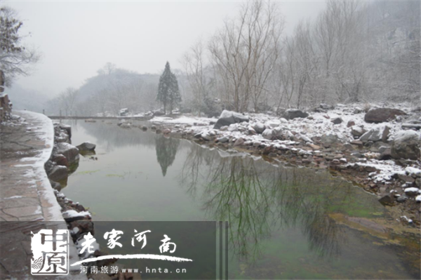白雪落在潭池上,瞬間演變成碧水,倒影著石頭和樹木的影子。八里溝馬武將軍也披上雪白的鎧甲。