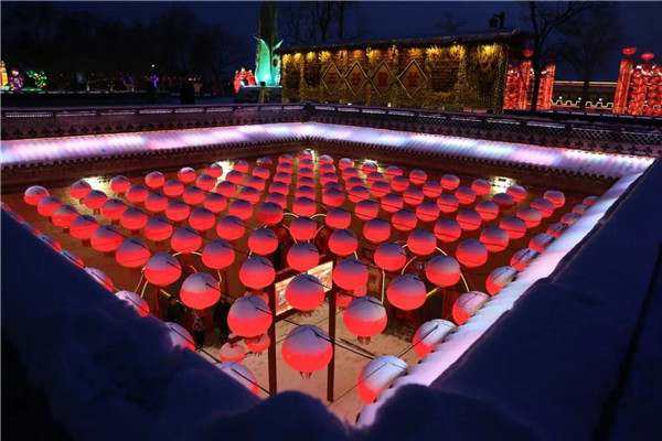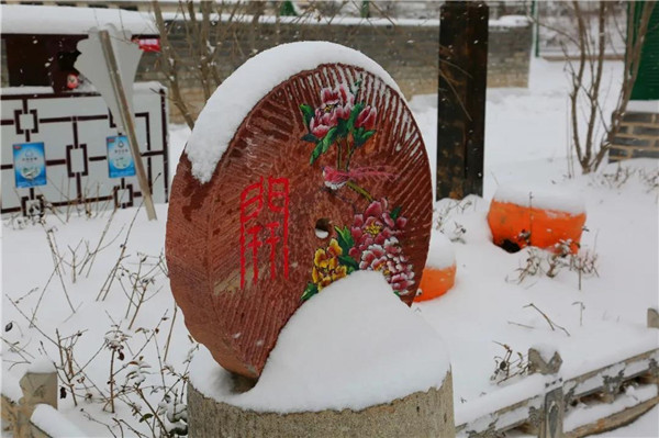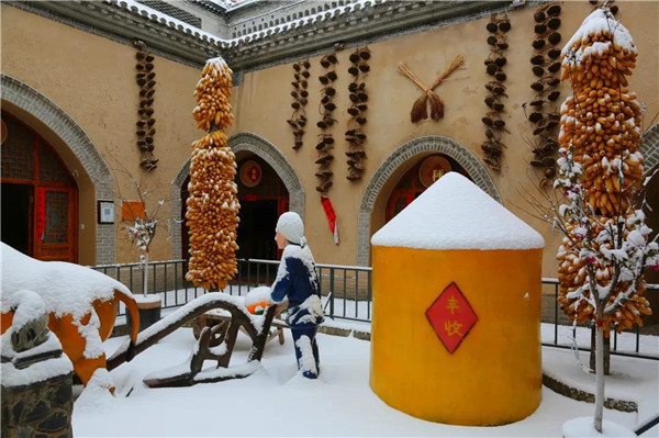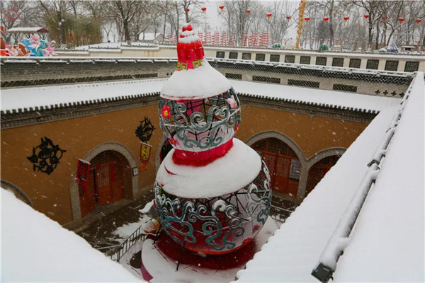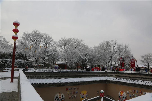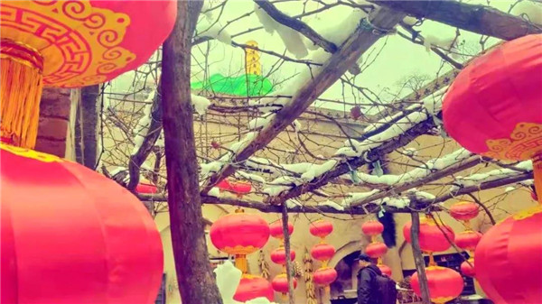 飄雪落于大地之上慢慢沉積,給整個(gè)村落穿上了一件白袍,銀裝素裹的大地上被凸起的攔馬墻勾勒出了一個(gè)個(gè)下凹的坑院。大紅的燈籠與古樸的青磚像是“飾品”,裝點(diǎn)了整個(gè)村落。