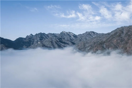 在海拔2000多米的洛陽(yáng)白云山,晨曦、云海、白雪交相輝映,形成天地一色的人間絕景。