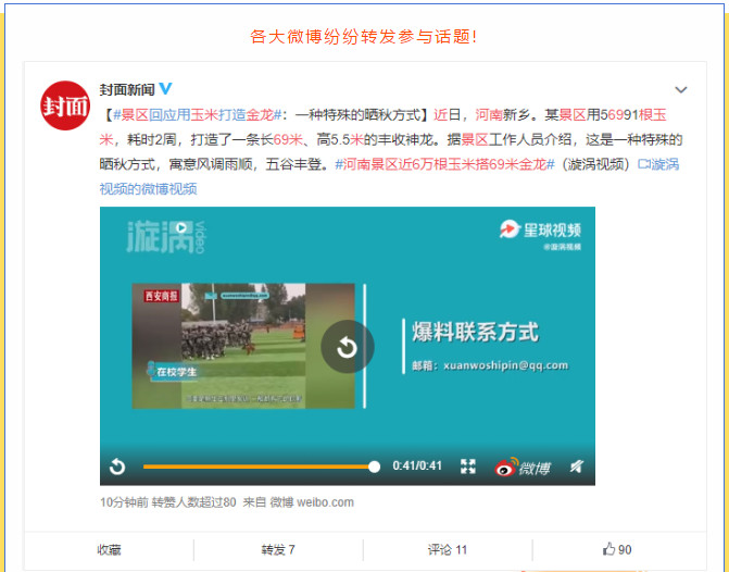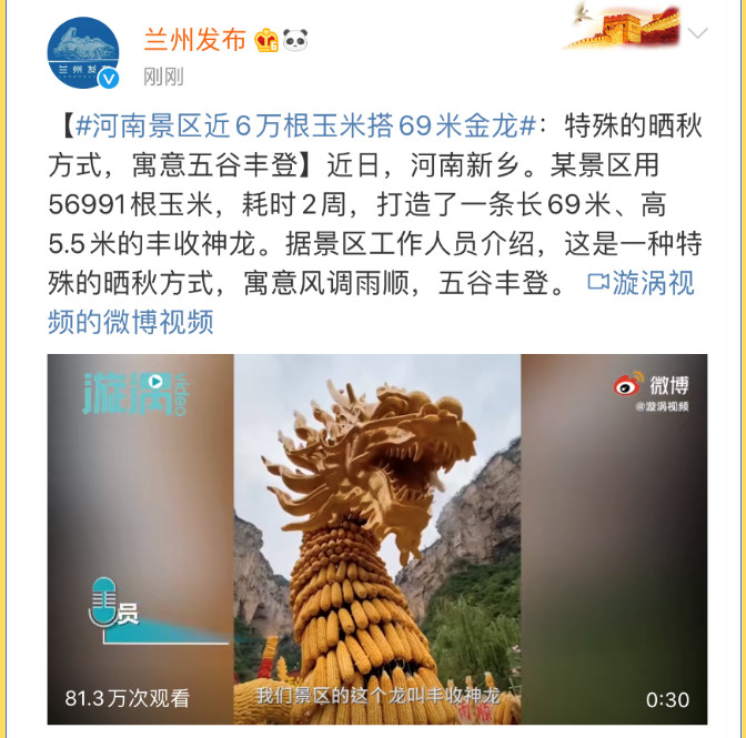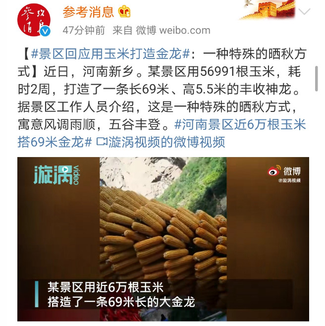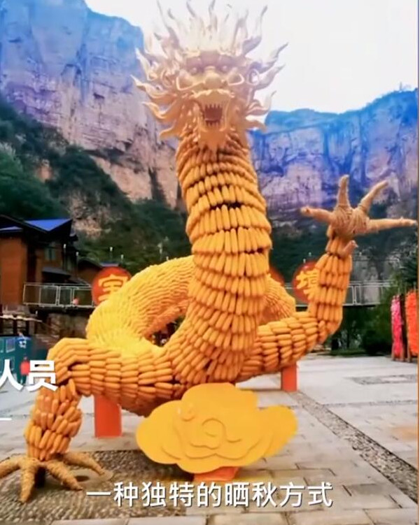 秋天是一個美麗的季節(jié),更是一個收獲的季節(jié)。近日,新鄉(xiāng)寶泉景區(qū)在秋趣文化節(jié)上用56991根玉米,耗時兩周,搭造的一條長69米、高5.5米豐收“神龍”,引發(fā)大量網(wǎng)友共鳴,沖上微博熱搜榜top3!據(jù)景區(qū)工作人員介紹,這是一種特殊的嗮秋方式,寓意風(fēng)調(diào)雨順,五谷豐登。