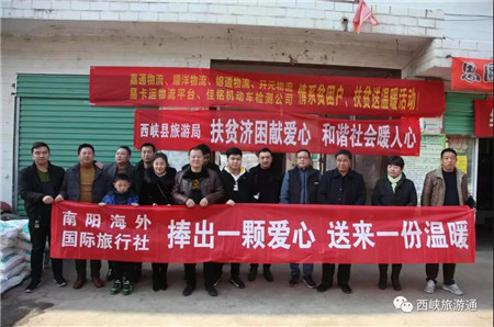 2018年12月14日,西峽縣旅游局?jǐn)y手7家物流企業(yè),來(lái)到丁河鎮(zhèn)黃草村看望貧困人口開(kāi)展愛(ài)心捐贈(zèng)活動(dòng),將米、面、油及衣物等物資送到他們手中,讓貧困戶溫暖過(guò)寒冬。