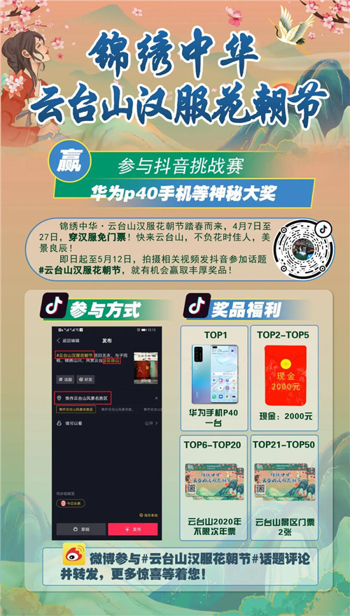 關(guān)注云臺(tái)山官方抖音賬號(hào)“云臺(tái)山”(抖音號(hào)628074886),上傳抖音視頻作品并插入話題#云臺(tái)山漢服花朝節(jié) @云臺(tái)山 進(jìn)行發(fā)布,即視為參與挑戰(zhàn)賽。
