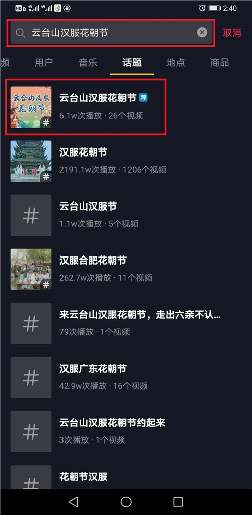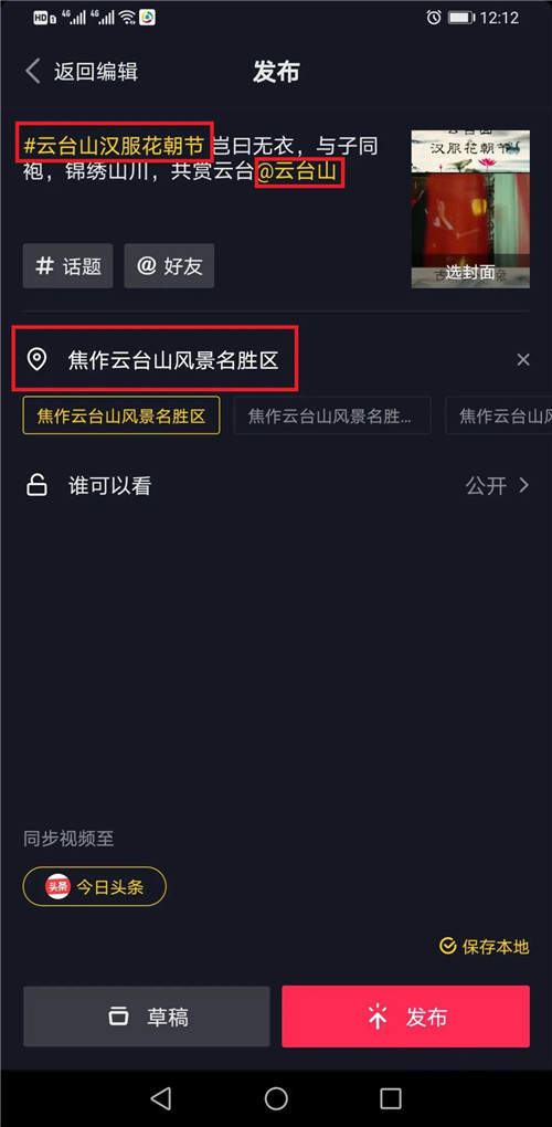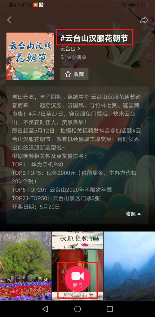 上傳視頻,添加#云臺(tái)山漢服花朝節(jié)話題,@云臺(tái)山并添加景區(qū)定位