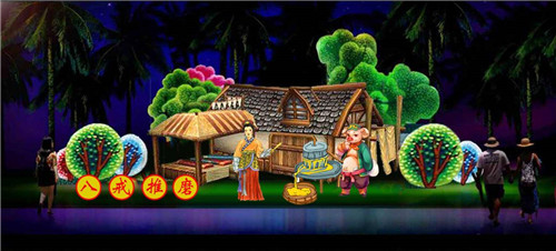 《吉時如意》的卡通生肖小豬,憨態(tài)可掬,令人喜愛;《大豬蹄子掰手腕》的豬八戒更是可以與小朋友進行掰手腕互動;《詩書傳家》、《無私奉獻》、《鬧春》中有從年畫里走出的福寶寶,生動活潑;《八戒推磨》也是取材西游記故事,一出妙趣橫生的彩燈情景劇。