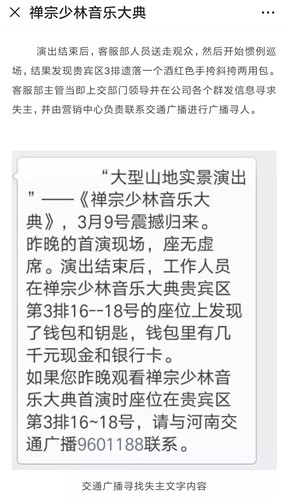 暖心,《禪宗少林·音樂大典》工作人員拾金不昧獲游客點贊!