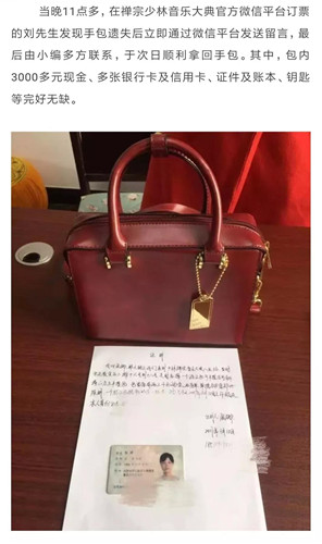 這種拾金不昧的情況,幾乎每年都會在音樂大典發(fā)生:2017年3月9日,2017版《禪宗少林·音樂大典》開演當天,來自鄭州的游客劉先生和家人不慎將挎包遺失在觀演區(qū),當時音樂大典的處理方法就很給力,最后劉先生和家人領回挎包以后,還專門寫了一篇文章對音樂大典表示感謝和肯定!
