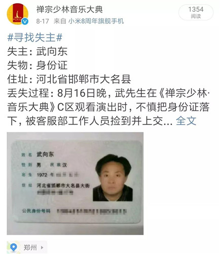 拾金不昧,是鄭州市天人文化旅游有限責(zé)任公司的企業(yè)文化之一,也是公司一直強(qiáng)調(diào)的所有員工都要遵守的工作職責(zé),這不僅是優(yōu)秀道德品質(zhì)的體現(xiàn),也是音樂(lè)大典每一位工作員人對(duì)工作負(fù)責(zé),對(duì)游客負(fù)責(zé)的一種態(tài)度,感謝大家一直以來(lái)對(duì)《禪宗少林·音樂(lè)大典》的信賴(lài)、關(guān)注和支持!