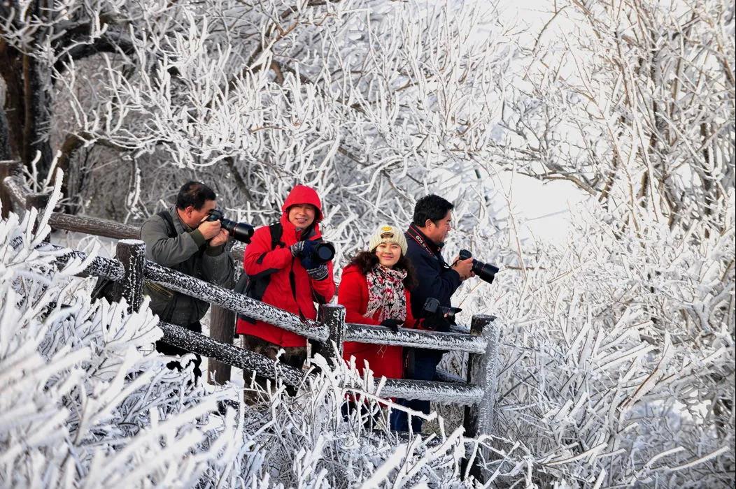 有人說,雞公山一入冬就會變了顏色,金黃、火紅不再,只?萑~于枝頭。等待一場雪的到來,再把這里變成冰白的世界。
