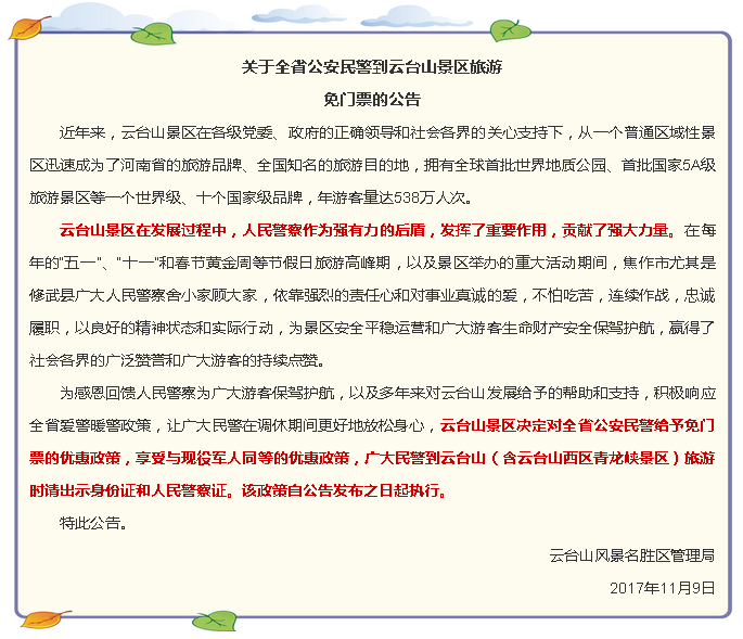 云臺(tái)山對(duì)全省公安民警免門票了!免!門!票!人民警察為人民,感謝你們的日夜守護(hù)、無(wú)私奉獻(xiàn),為全體公安民警點(diǎn)贊!