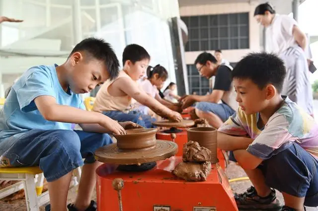 “黑陶以紅膠土、紅膠泥為原料,歷經(jīng)72道工藝塑形,再用900℃高溫焙燒……”沁陽神農(nóng)陶創(chuàng)意園負責人湯麗負責給研學的游客講解黑陶的制作工藝,這是她的工作日常。暑期來臨,研學旅行火爆,前來參觀、學習、體驗黑陶制作的學子絡(luò)繹不絕。