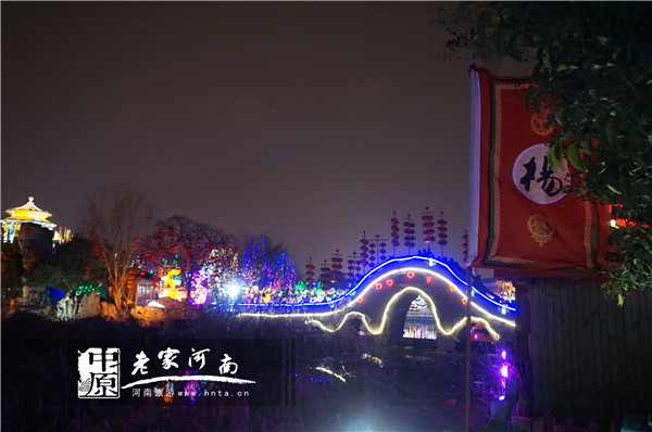 其中,設(shè)置在景區(qū)北大門外的《瑞鳳賀春》燈組氣勢宏大。這里,6根華麗的“牡丹花柱”高高聳立,一座“彩門”凌空飛架,兩面楊家將“帥旗”迎風(fēng)招展,巨大的“雄雞”兀立在“彩門”之上展開七彩羽翼,并“浴火重生”嬗變?yōu)?ldquo;火鳳”,從而形成一種巨大的視覺張力,也傳遞出人們對生活的美好祝愿。而設(shè)置在“楊府家宅”西花園的《富貴吉祥》和《天鵝湖》燈組則另有一種韻味。這里,一朵碩大的“紅牡丹”吐露芳菲,綻放在碧波潭中;兩只姿態(tài)優(yōu)雅的“天鵝”曲頸長吟,帶領(lǐng)著一群“小天鵝”在水面嬉戲;周邊山石嶙峋、彩蝶紛飛,無數(shù)“吉祥果”在樹叢中輕輕搖弋,從而使一幅有滋有味的“庭院美景”驀然展現(xiàn)在人們面前,讓眾多游客流連忘返。