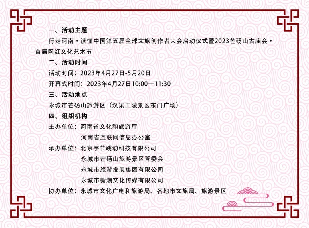 第五屆全球文旅創(chuàng)作者大會暨芒碭山古廟會·首屆網(wǎng)紅文化藝術(shù)節(jié)4月27日開幕