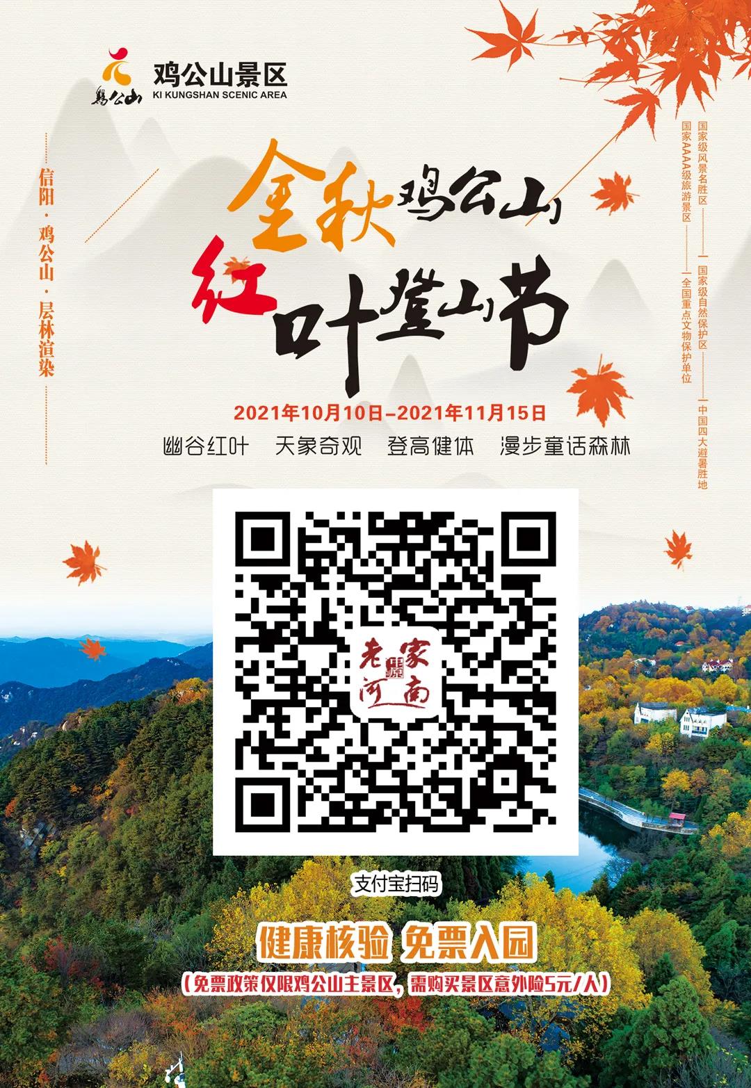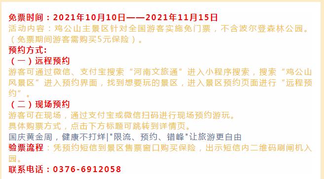 10月10日——11月15日,雞公山主景區(qū)對全國人民免門票,不含波爾登森林公園。(免票期間游客需購買5元保險)。