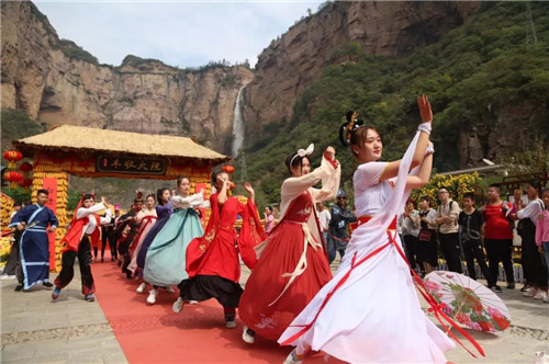 古裝巡游和快閃相結(jié)合,是寶泉景區(qū)為游客在花徑大道搭建的沉浸式體驗(yàn)區(qū),演員與游客共同走在花徑上不分彼此,音樂響起一起舞蹈,好不自在逍遙。