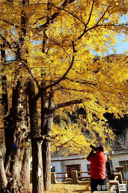 方圓數(shù)里數(shù)百株銀杏樹滿山遍野,形成了一個銀杏林,彌漫著金色輝煌和田園詩意。