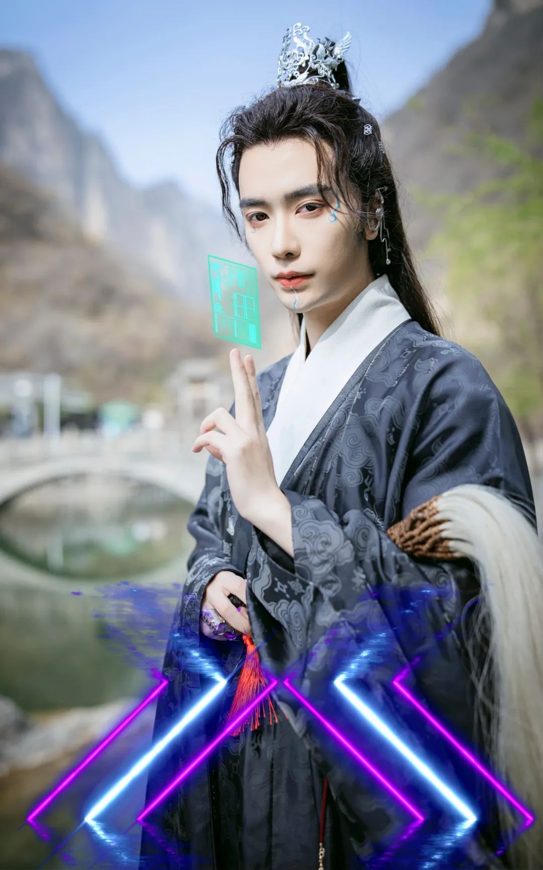 傳統(tǒng)漢服+科幻機(jī)能,光影夢幻霓虹與國潮漢服交錯(cuò),炫彩斑斕的賽博朋克空間,艾綠和亮藍(lán)的跳躍感與碰撞,光影迷離,縱橫交錯(cuò),沉浸體驗(yàn)。