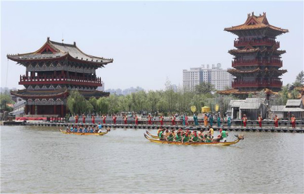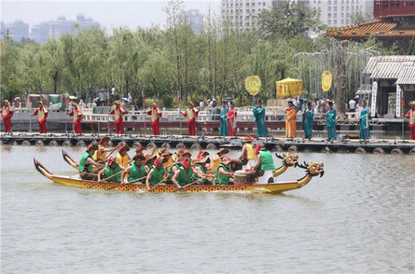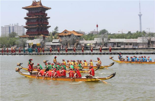 5月28日,清明上河園內(nèi)表演的龍舟比賽精彩紛呈,吸引許多游客觀看。